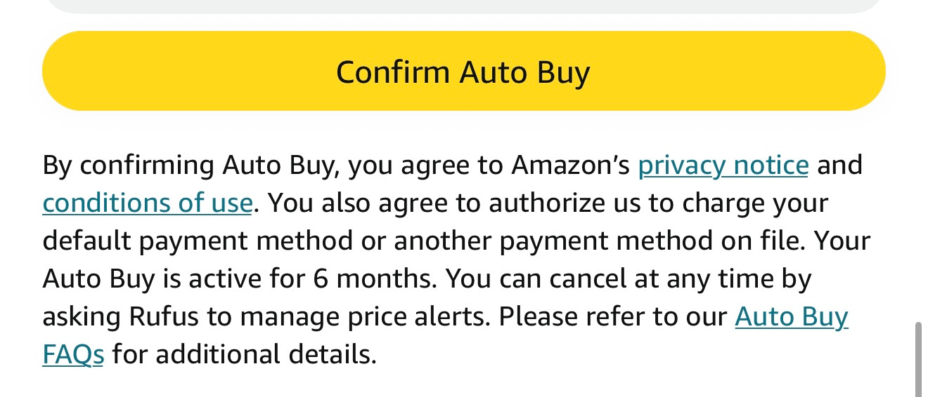 To set it up, open the Amazon mobile app, find a product, and tap the little Rufus icon — that’s their AI. Tell it to “set a price alert,” and you’ll see options based on recent prices and discounts. You can choose a specific price or a percentage off. If the item drops to your target, the AI will automatically purchase it using your saved payment method and shipping address. Amazon says you’ll still have 24 hours to cancel. You can have up to 200 of these triggers active at once.