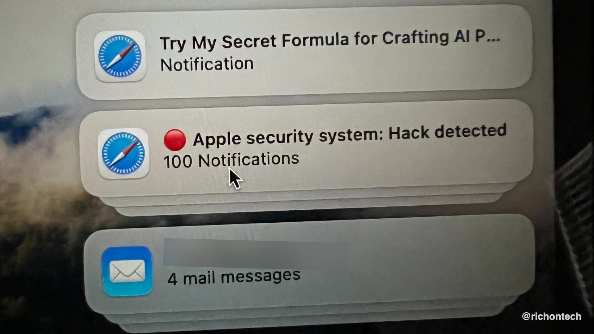 Rene, these are almost certainly fake scare notifications from a website you accidentally allowed to send alerts. They’re designed to look official and alarming, but they’re not coming from your computer or Apple.