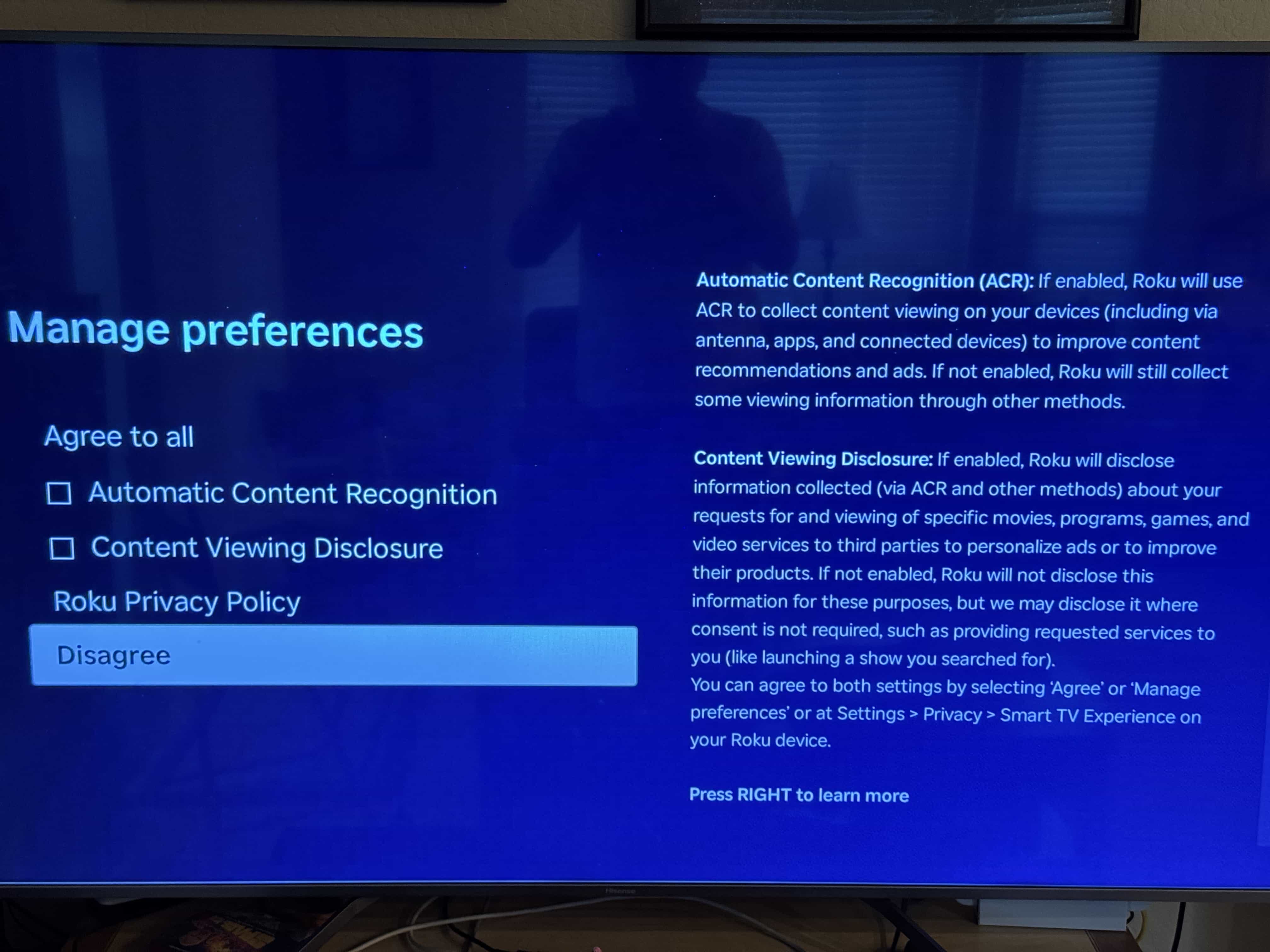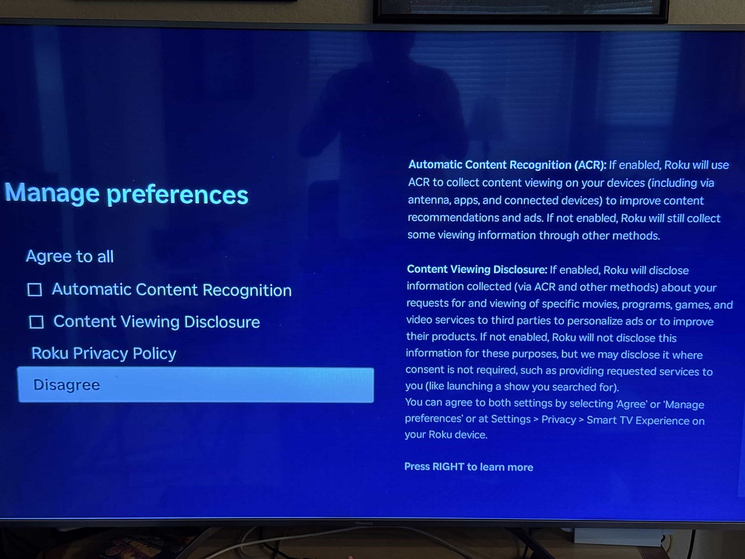 Good call, Jim. That screen controls Roku’s Automatic Content Recognition (ACR) and Content Viewing Disclosure. ACR scans what you watch — even from antenna or connected devices — to recommend content and personalize ads. If you care about privacy, leave both boxes unchecked or choose Disagree.