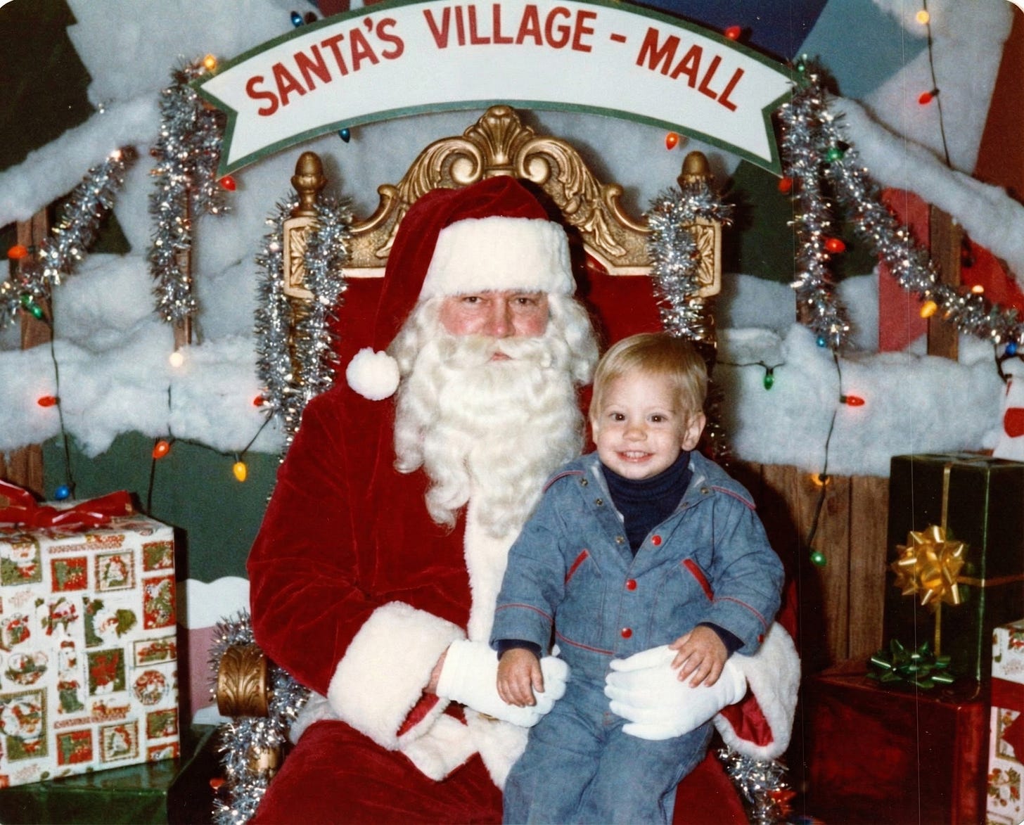 recreate a nostalgic mall santa photo of me sitting on santa’s lap with classic mall decor, soft film grain, and faded holiday colors.