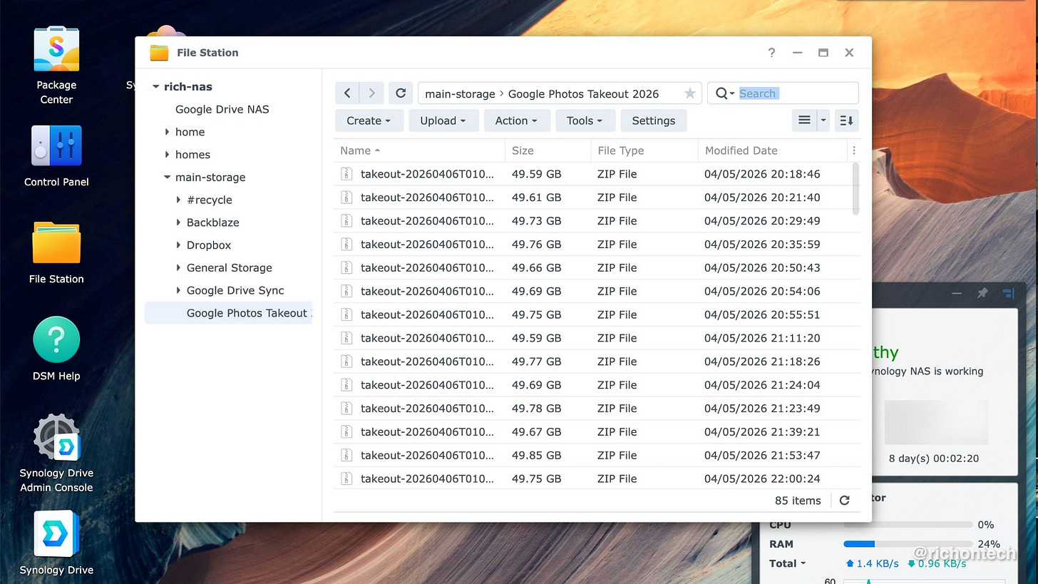 I tested syncing with both Google Drive and Dropbox, made some changes, and confirmed everything worked correctly. Once I knew it was solid, I upgraded my Google Drive storage to 10 TB to handle the Takeout files.