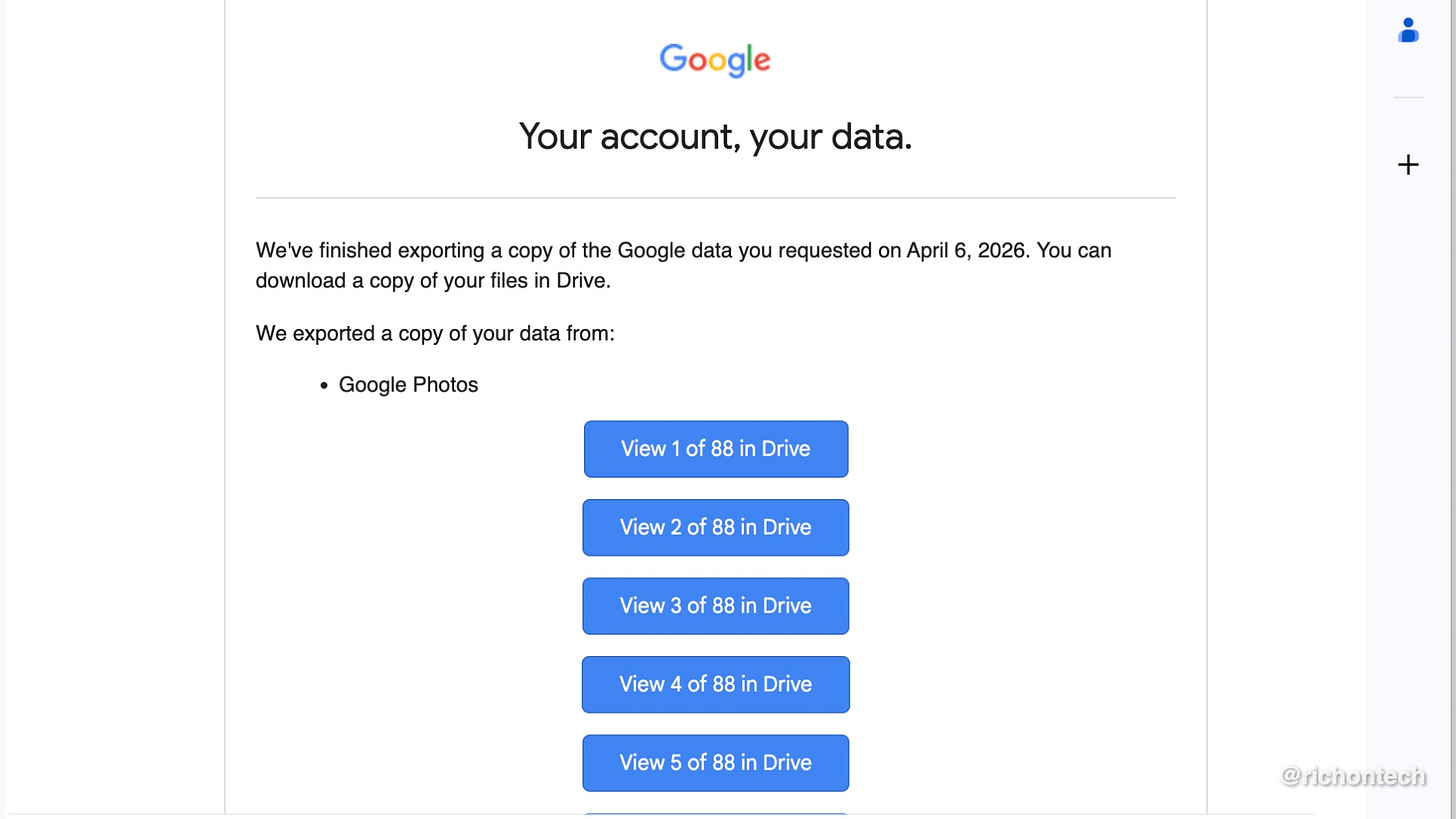 Google splits Takeout exports into 50 GB chunks. For me, that meant 88 separate files.