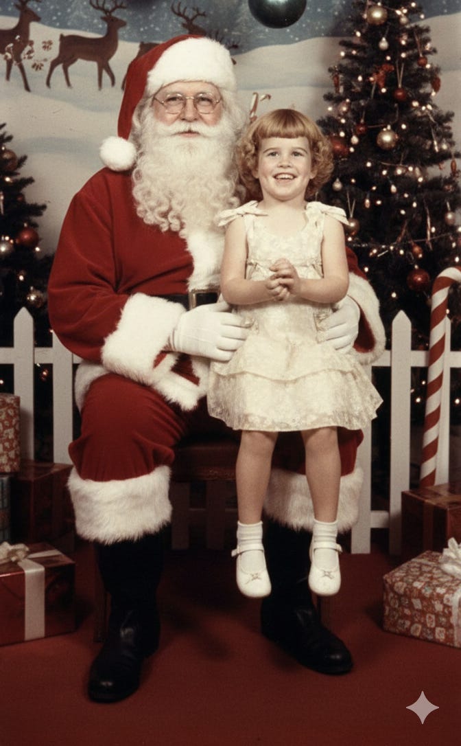 Reader Candice went a different route and had a little more fun. She generated a nostalgic Christmas photo of herself sitting on Santa’s lap and sent the AI image to a group text with her siblings.