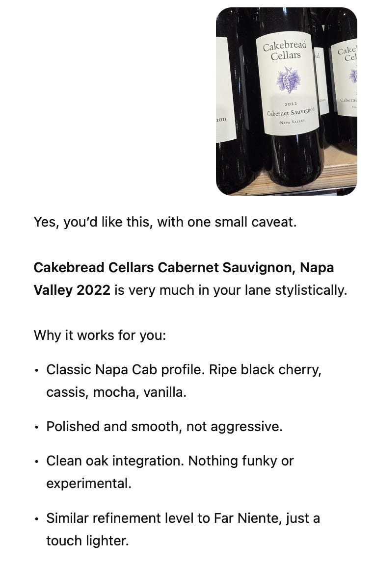 Now I can upload a photo of a wine list at a restaurant, snap a picture of a bottle label, or just type in the name of a wine. ChatGPT gives me a detailed breakdown of whether I’d like it or not, including the style, flavor profile, and how it compares to wines I already enjoy.