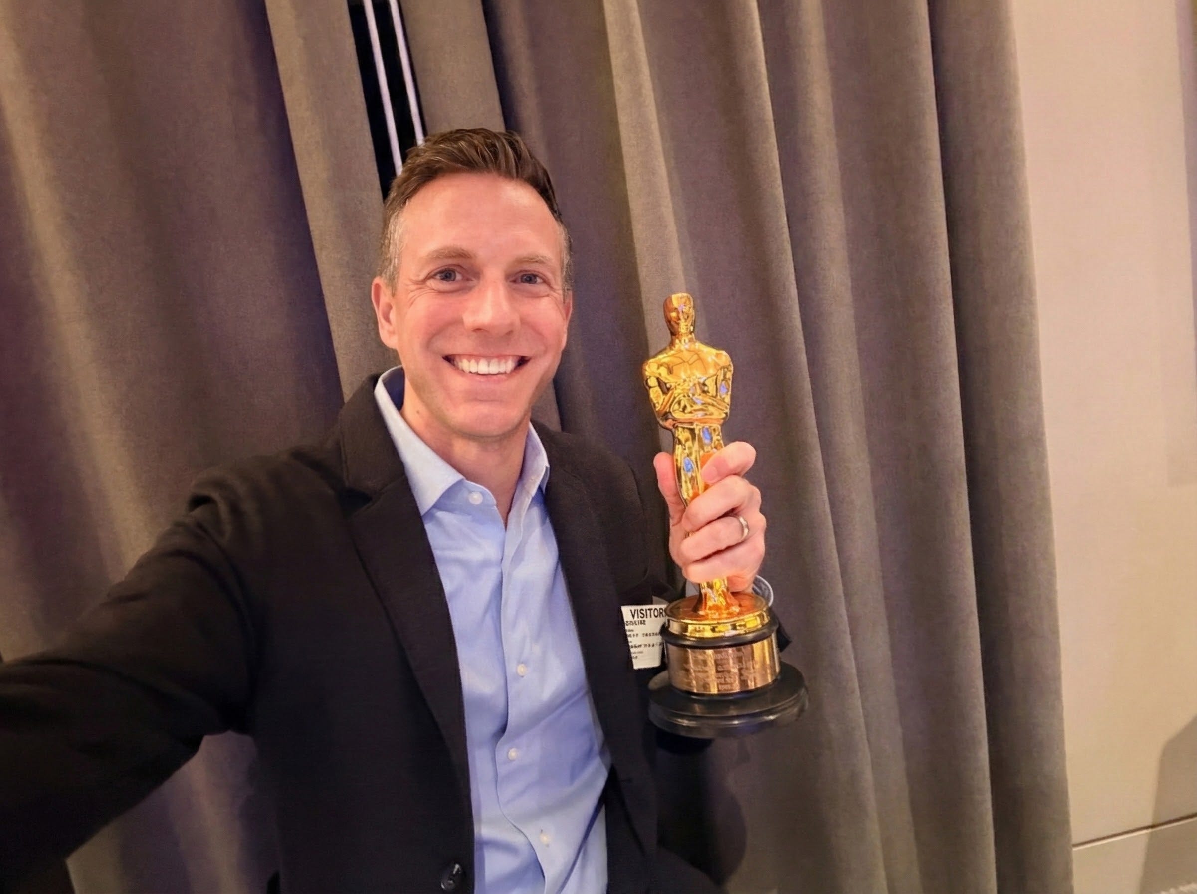 We sat through a demo to hear what these speakers can do, followed by a fireside chat with Oscar-winning composer Kris Bowers. Hence the photo of me holding an Oscar.
