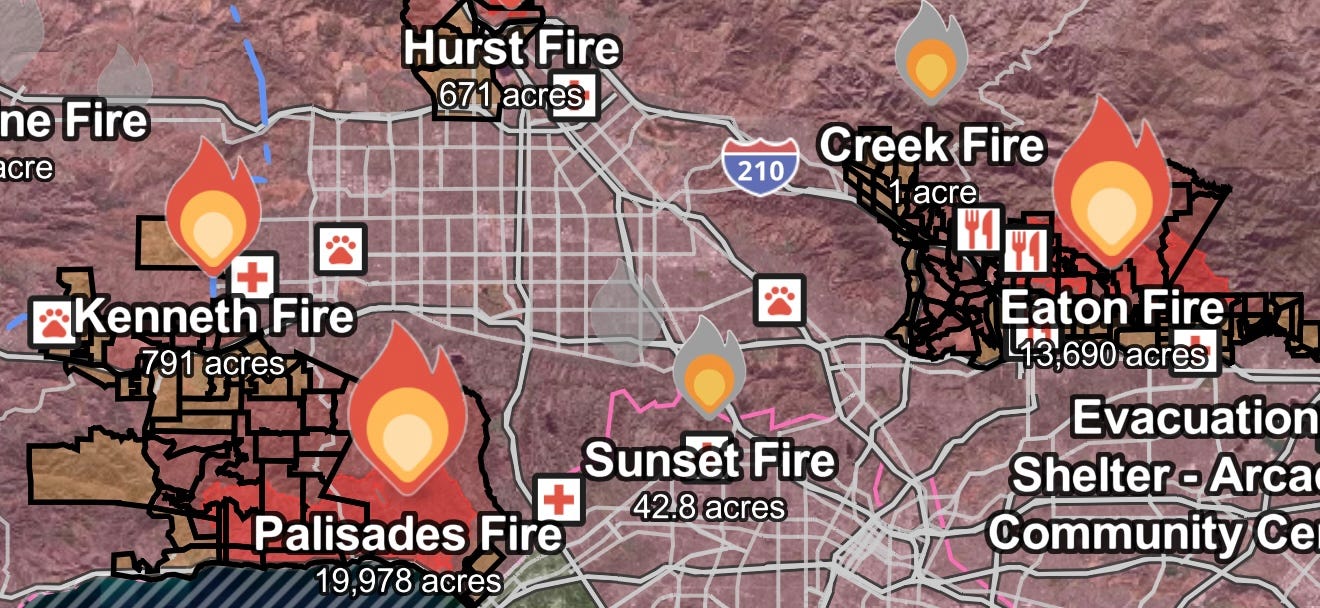 • Los Angeles Fire Department: Provides detailed information on multiple wildfires, evacuation zones, emergency alerts, and safety tips.
